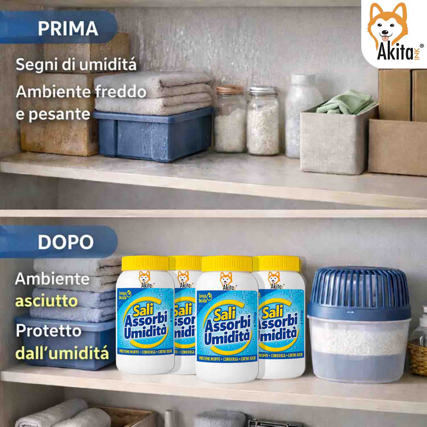 I sali assorbi umidità AkitaInk – set da 4 confezioni da 750 g sono una soluzione pratica, efficace e conveniente per contrastare l’umidità in eccesso negli ambienti chiusi. I cristalli bianchi inodori, composti da cloruro di calcio ≥95%, assorbono l’umidità presente nell’aria trasformandola in liquido, facilmente smaltibile.
