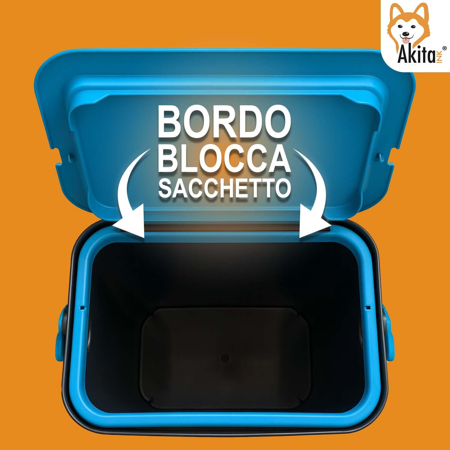 Dotata di un manico multifunzione, può essere trasportata facilmente e, una volta ripiegato sul lato frontale, consente di bloccare l’apertura, evitando fuoriuscite accidentali e proteggendo i rifiuti da bambini o animali domestici. L’interno è completato da un anello portasacchetto che mantiene il sacco ben fermo, impedendo spostamenti e mantenendo l’ordine.