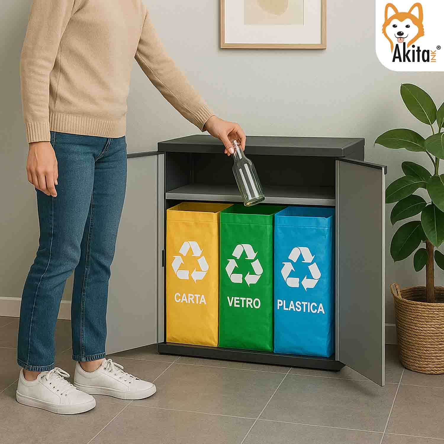 L’armadietto per la raccolta differenziata, dotato di due ante, un ripiano e tre borse per la raccolta differenziata, è il prodotto dal design semplice e lineare per la raccolta differenziata.