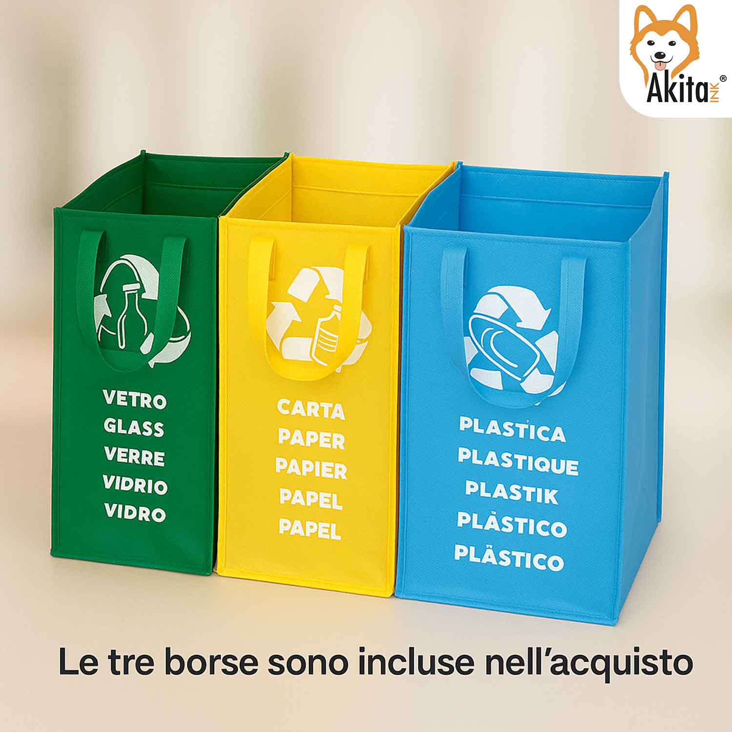 I ripiani ed i pannelli sono in resina di PVC; base, copertura superiore, copertura posteriore, montanti, maniglie e borse per la raccolta differenziata in resina di PP. Tutti i materiali usati per la realizzazione di questo prodotto sono di seconda vita certificati.