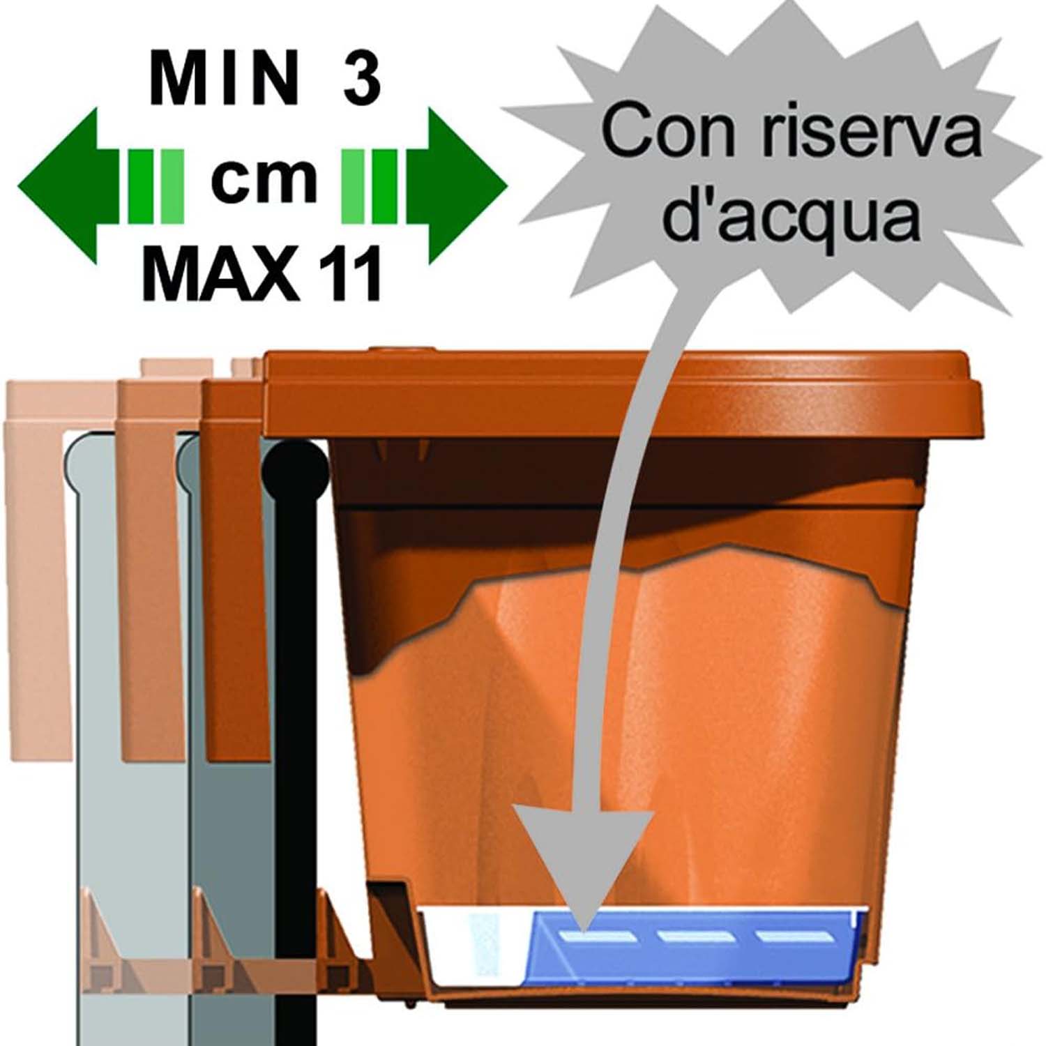 Realizzate con agganci regolabili universali e dotate di riserva d’acqua integrata, queste fioriere assicurano una crescita sana delle piante riducendo la necessità di annaffiature frequenti.