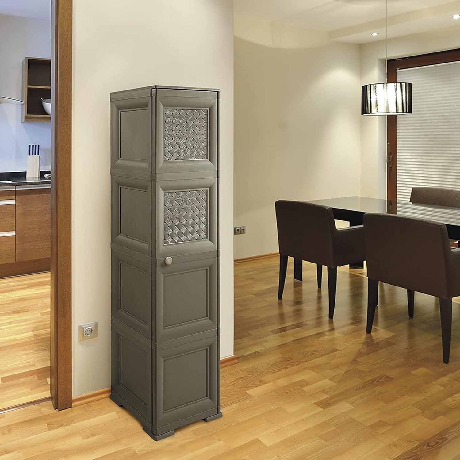 Realizzata in plastica resistente, è ideale per ambienti come bagno, cucina, lavanderia, ufficio o ripostiglio. Il design in colore wengé con ante lisce dona un aspetto moderno e discreto, facilmente abbinabile a diversi stili di arredamento.