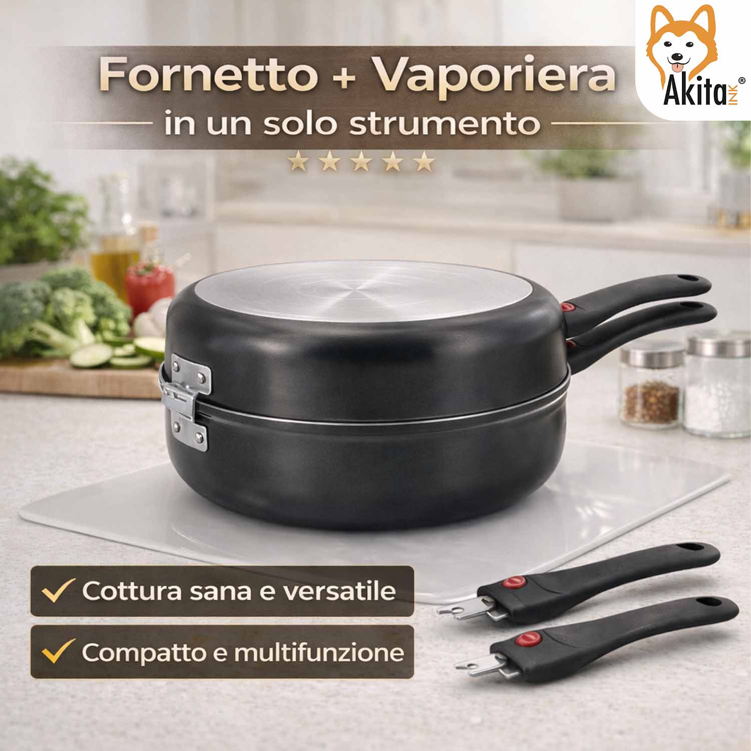 La vera innovazione è data dai manici estraibili, che permettono di separare le due padelle e trasformarle all’occorrenza in due teglie rotonde, rendendo il prodotto utilizzabile sia sul fuoco che nel forno. La vaporiera integrata consente una cottura delicata, preservando le proprietà nutritive degli alimenti.