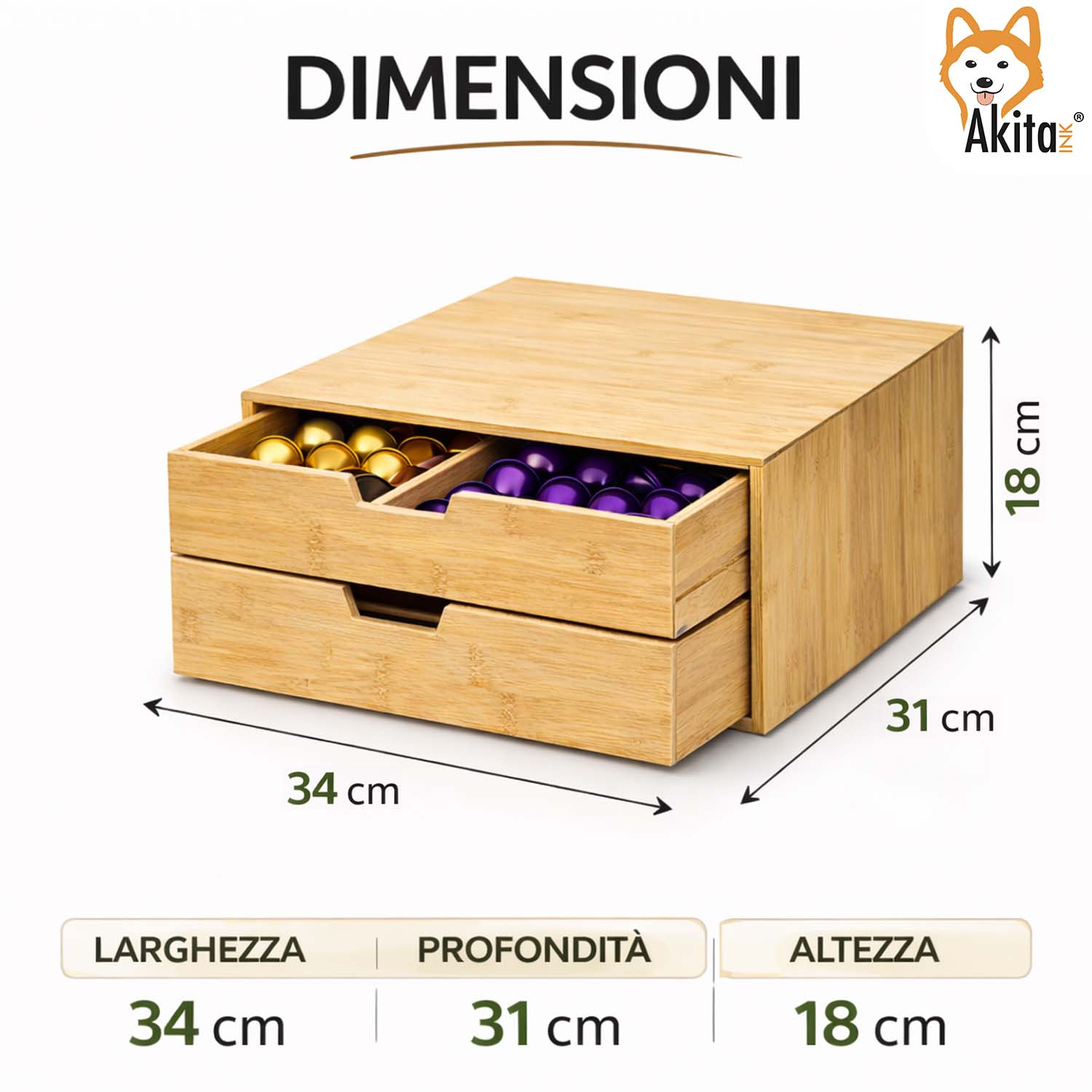 Portacapsule in bamboo con doppio cassetto, compatibile con capsule Nespresso, Dolce Gusto e Modomio. Ideale anche per cialde, tè e zucchero. Dimensioni 34x31x18 cm.