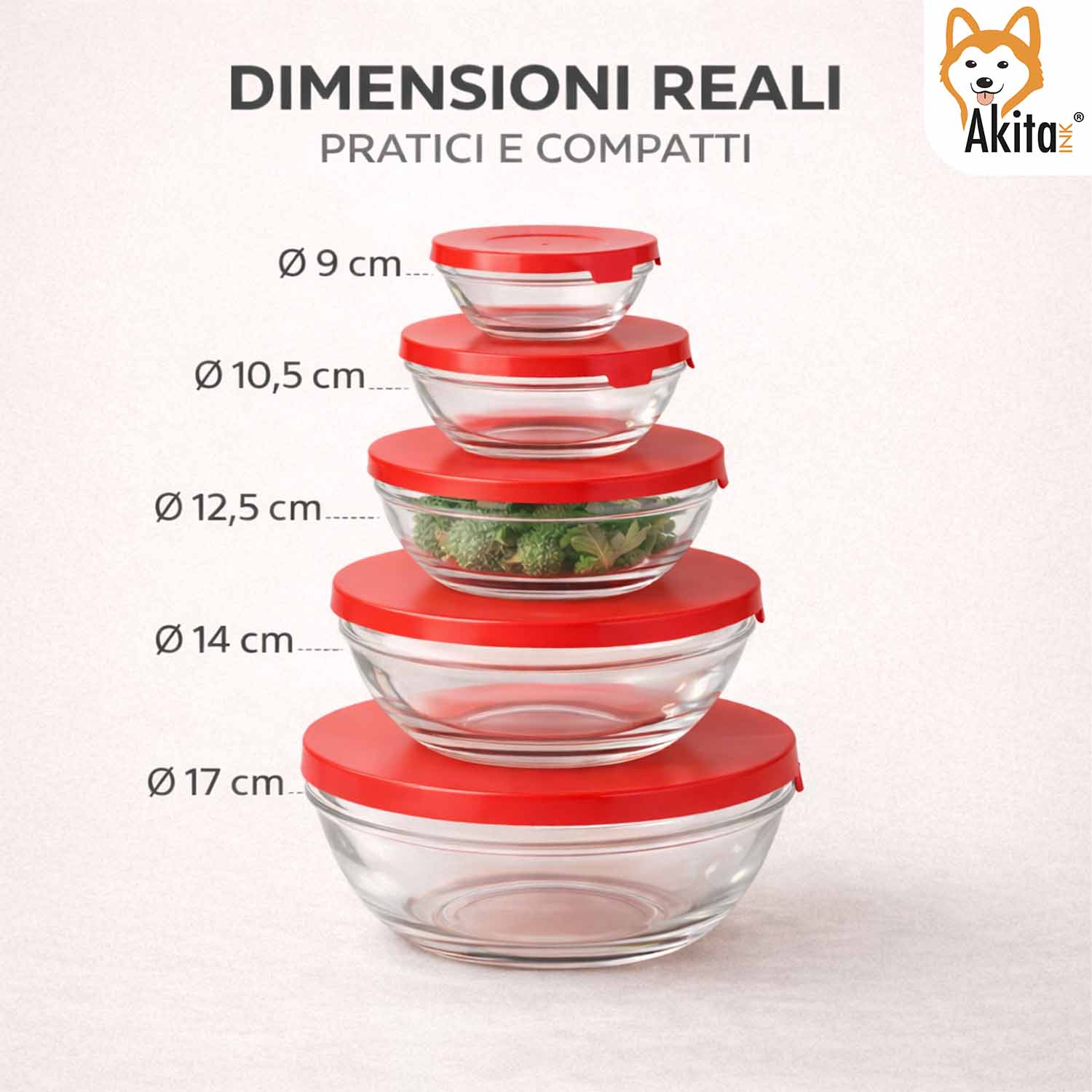 Il set include 5 contenitori di diverse dimensioni, adatti a porzioni differenti e a molteplici esigenze di conservazione quotidiana.